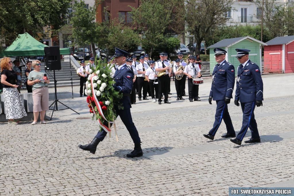 Na zakończenie uroczystości Zastępca Komendanta Wojewódzkiego Policji w Kielcach Pana insp. Jacek Cholewa wspólnie z Komendantem Powiatowym Policji w Ostrowcu Świętokrzyskim Panem mł. insp. Wojciechem Szymczakiem złożyli wieniec przy pomniku upamiętniającym egzekucję mieszkańców Ostrowca Świętokrzyskiego, do której doszło 30.09.1942 roku.
