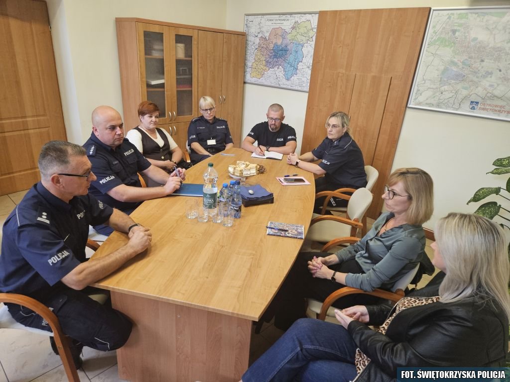 Wczoraj o godzinie 13.15 w gabinecie Komendanta Powiatowego Policji w Ostrowcu Świętokrzyskim mł. insp. Wojciecha Szymczaka odbyło się spotkanie z pracownikami Centrum Usług Społecznych. Wspólne rozmowy miały na celu usprawnienie współpracy i praktyk pomiędzy obydwoma instytucjami, tak aby, jak najbardziej efektywnie działać w zakresie udzielania pomocy środowiskowej. Podczas spotkania poruszono również kluczowe zagadnienia dotyczące ochrony dzieci, które mogą być ofiarami przemocy oraz zaniedbań. Uczestnicy zgodnie wskazali, że nadrzędnym priorytetem jest zapewnienie bezpieczeństwa najmłodszym oraz szybkie reagowanie na wszelkie sygnały o ich zagrożeniu. Rozmawiano również o konieczności stałej wymiany informacji i doświadczeń pomiędzy instytucjami, aby podejmowane działania były jak najbardziej skuteczne.