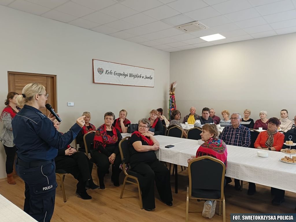 Wczoraj policjantki z Zespołu Profilaktyki Społecznej ostrowieckiej komendy wzięły udział w spotkaniu zorganizowanym przez Koło Gospodyń Wiejskich w Janiku. Podczas prelekcji mundurowi omówili zagadnienia związane z bezpieczeństwem seniorów. Szczególną uwagę funkcjonariuszki zwróciły na oszustwa, jakie są popełniane wobec tej właśnie grupy społecznej. Mundurowe przekazały seniorom niezbędną wiedzę, mającą na celu zwiększenie ich bezpieczeństwa oraz uświadomienie, jak nie stać się ofiarą przestępstw metodą „na wnuczka”, „policjanta” czy też „na pracownika banku ”. Policjantki poinformowały również słuchaczy, że podawanie się za krewnych, funkcjonariuszy Policji czy pracowników różnych instytucji oraz firm usługowych to najczęściej stosowana metoda przez oszustów, których ofiarami padają z reguły osoby starsze lub samotnie mieszkające. Prowadzący prelekcje wyjaśnili również, jak można w prosty sposób poinformować mundurowych o niepokojących sprawach występujących w środowisku lokalnym za pomocą Krajowej Mapy Zagrożeń Bezpieczeństwa. Uczestnicy spotkania dowiedzieli się, jak funkcjonuje to narzędzie i jakie sytuacje oraz zagrożenia można tam nanosić.