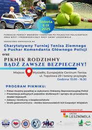 Fundacja Pomocy Wdowom i Sierotom po poległych Policjantach oraz Wójt i Przewodniczący Rady Gminy Lesznowola serdecznie zapraszają na Charytatywny Turniej Tenisa Ziemnego o Puchar Komendanta Głównego Policji i piknik rodzinny „Bądź zawsze bezpieczny!”.